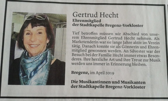 Wir trauern um unser Ehrenmitglied Fr. Gertrude Hecht! (verstorben am 18.04.2019)